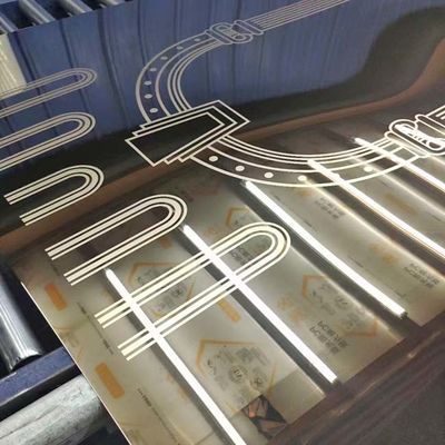 I modelli incisi sono creati selettivamente applicando un film resistente all'acido protettivo alle aree ed alla morsura nominate le aree non protette. Incisione rimuove uno strato sottile di acciaio inossidabile, commutatore il colore ad un grigio d'argento smussato ed irruvidisce la superficie, che può essere contrapposta con la molatura, lo specchio eccellente o altri rivestimenti per creare migliaia di variazioni. Il rivestimento inciso anche può essere colorato prima o dopo incisione. Era ampiamente usato per le applicazioni della decorazione, quali le porte dell'elevatore, i pannelli di parete, fare fronte e la disposizione.